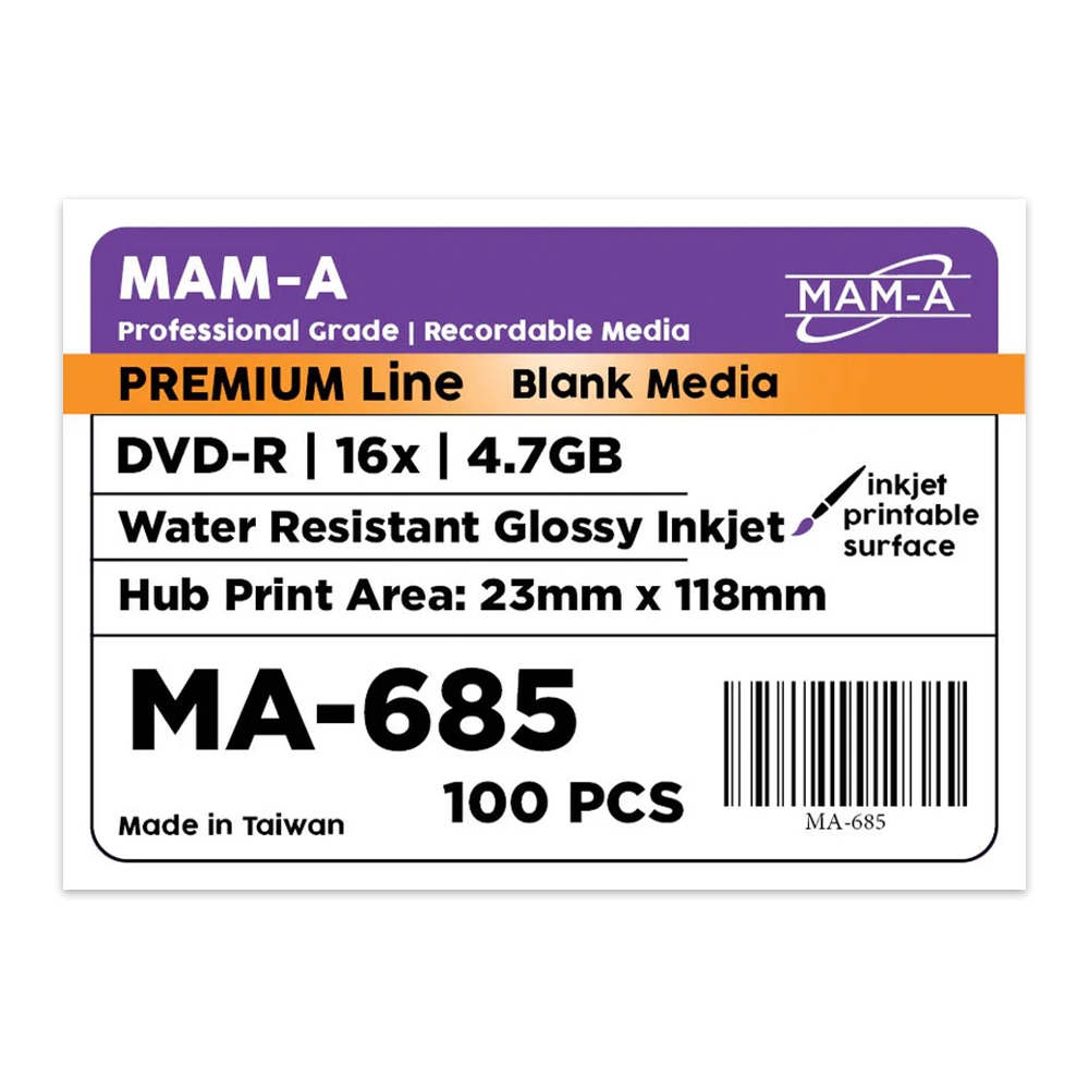 MAM-A Premium Water Resistant Glossy Inkjet DVD-Rs deliver a superior silver coat finish, optimized for crisp, vibrant thermal printing. Designed for professional use, these discs combine excellent print quality with reliable performance.