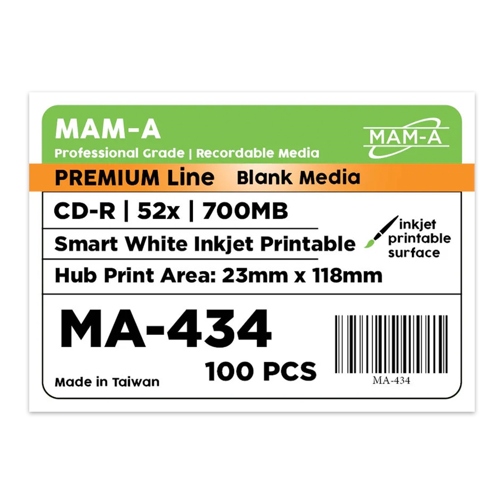 MAM-A Smart White Inkjet CD-Rs deliver a superior white coat finish, optimized for crisp, vibrant inkjet printing. Designed for professional use, these discs combine excellent print quality with reliable performance.