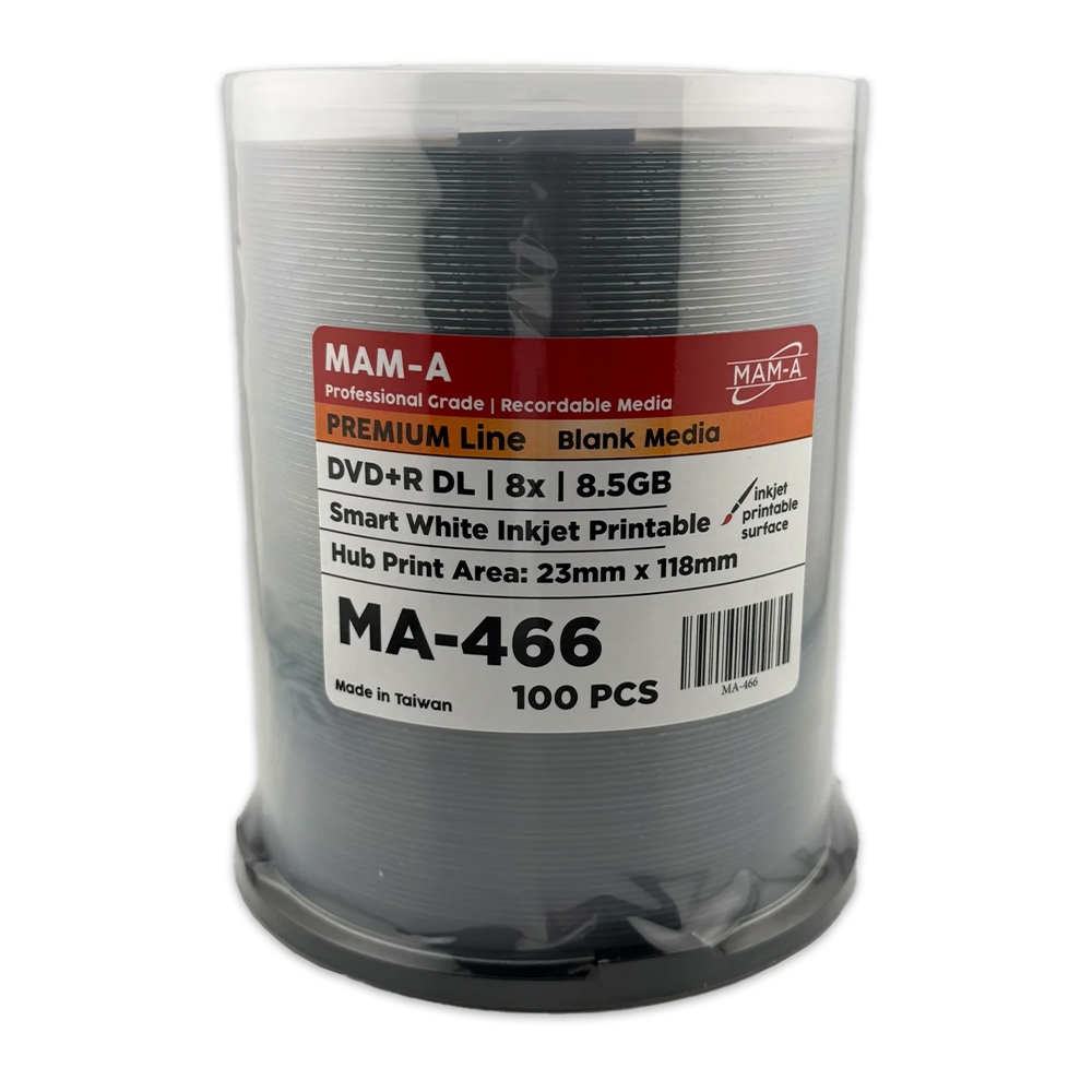 MAM-A Premium Dual Layer Smart-White Inkjet DVD+R DLs deliver a superior white coat finish, optimized for crisp, vibrant inkjet printing. Designed for professional use, these discs combine excellent print quality with reliable performance.