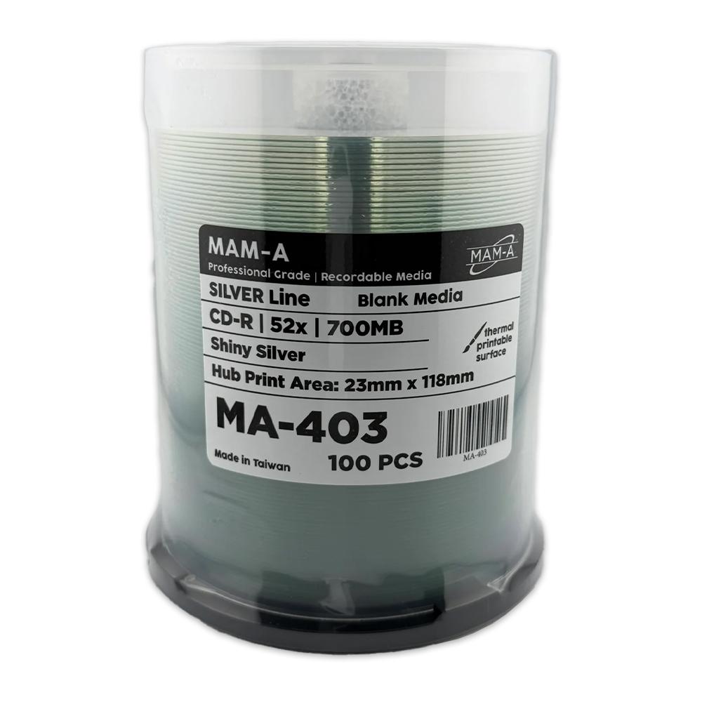 MAM-A Silver Line Shiny Silver CD-Rs deliver a superior silver coat finish, optimized for crisp, vibrant thermal printing. Designed for everyday use, these discs combine excellent print quality with reliable performance.