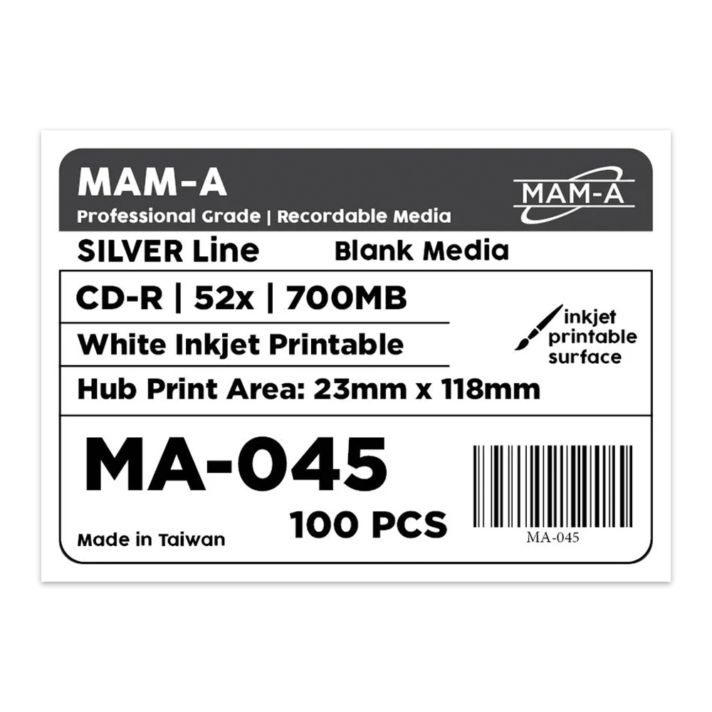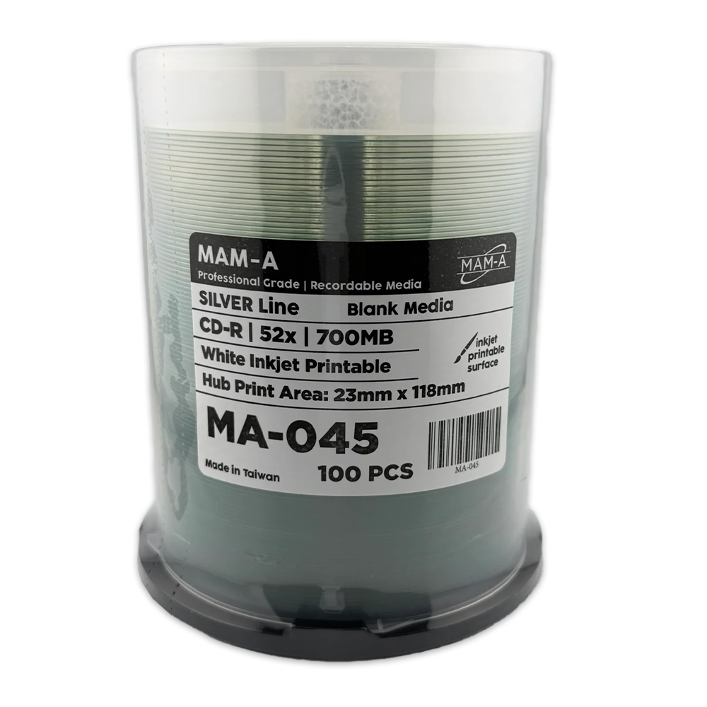 MAM-A White Inkjet Silver Line CD-Rs deliver a superior silver coat finish, optimized for crisp, vibrant thermal printing. Designed for everyday use, these discs combine excellent print quality with reliable performance.